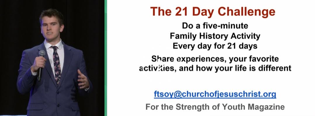 View It's Your Story, a presentation from RootsTech 2025 in which Seth Christensen (a youth from Bluffdale, Utah) invites the youth of the church to accept a 21-day challenge to do temple and family history work every day for three weeks and share the results of the changes in their lives (timestamp 56:56).
