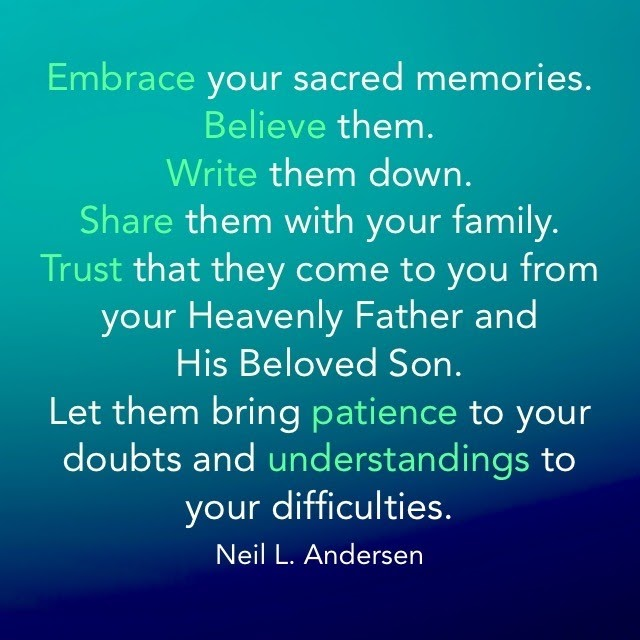"When our children were very small, I started to write down a few things about what happened every day...so that my children could have the memory someday when they would need it ... Before I would write, I would ponder this question: 'Have I seen the hand of God reaching out to touch us or our children or our family today?' ...I realized that trying to remember had allowed God to show me what He had done. More than gratitude began to grow in my heart. Testimony grew. I became ever more certain that our Heavenly Father hears and answers prayers. I felt more gratitude for the softening and refining that come because of the Atonement of the Savior Jesus Christ. And I grew more confident that the Holy Ghost can bring all things to our remembrance—even things we did not notice or pay attention to when they happened." Henry B. Eyring, O Remember, Remember.