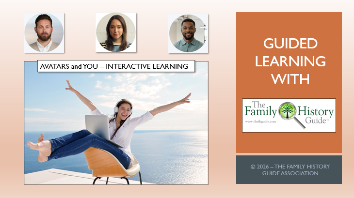 Welcome! Select any video link on this page to get a start your Guided Learning journey in The Family History Guide. Each video is hosted by one of our AI friends who will take you step-by-step through The Family History Guide experience. Once the video begins, you can click the broken-box icon to watch in full-screen mode. Enjoy!